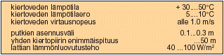 Lattialämmityksen mitoituksessa käytettäviä arvoja