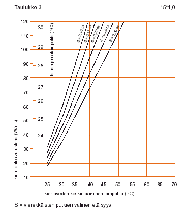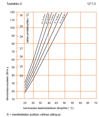 - Taulukoista 1, 2, 3 ja 4 määritellään tarvittava lattialämmitysputkien asennusväli, kun tiedetään kiertoveden keskilämpötila (°C) ja vaadittava